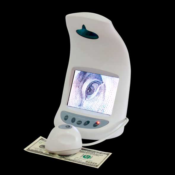 Con el cable adaptador de imagen, USB y AV, puede transferir la imagen a computadora o proyector y guardar e imprimir las características de seguridad. Es también una buena herramienta para la enseñanza del conocimiento sobre falsificaciones en instituciones financiera.